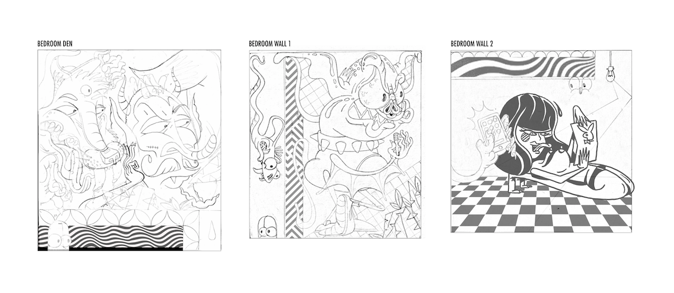 A Private Commission in a concrete 3-storey mansion on a mountain in Vail, Colorado. The owners wanted a series of cheeky murals to go around the interiors and to complement their naughty lifestyles. 3 bedroom accent walls and a 40ft glass elevator shaft was painted. (sorry no photos of the painted shaft yet) :P