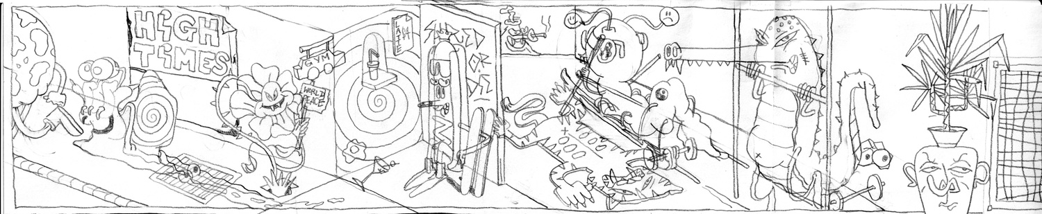 Entrance Mural for the Employee Store at Hurley HQ. A scene of characters in their surf mobiles headed to the beach.